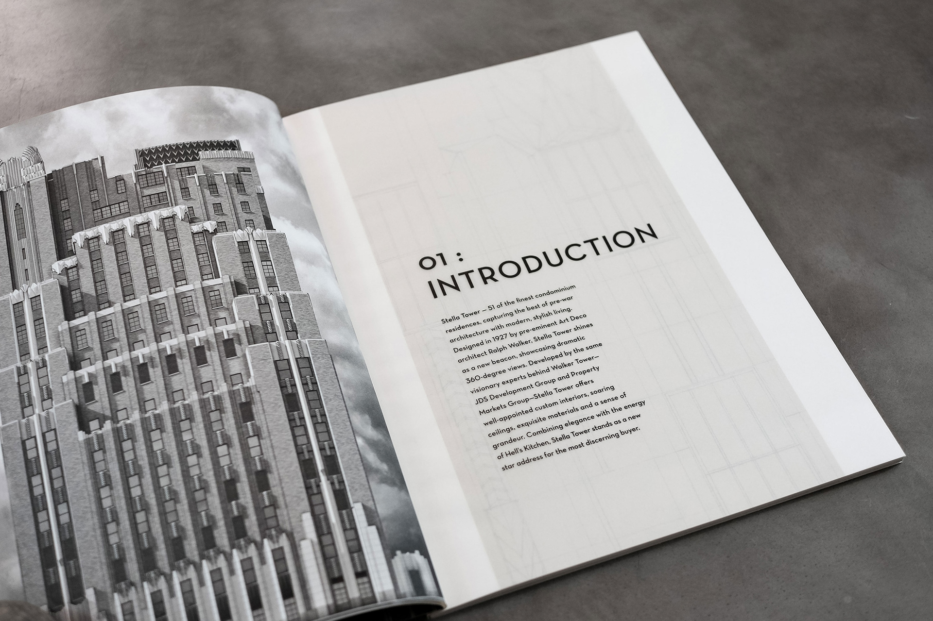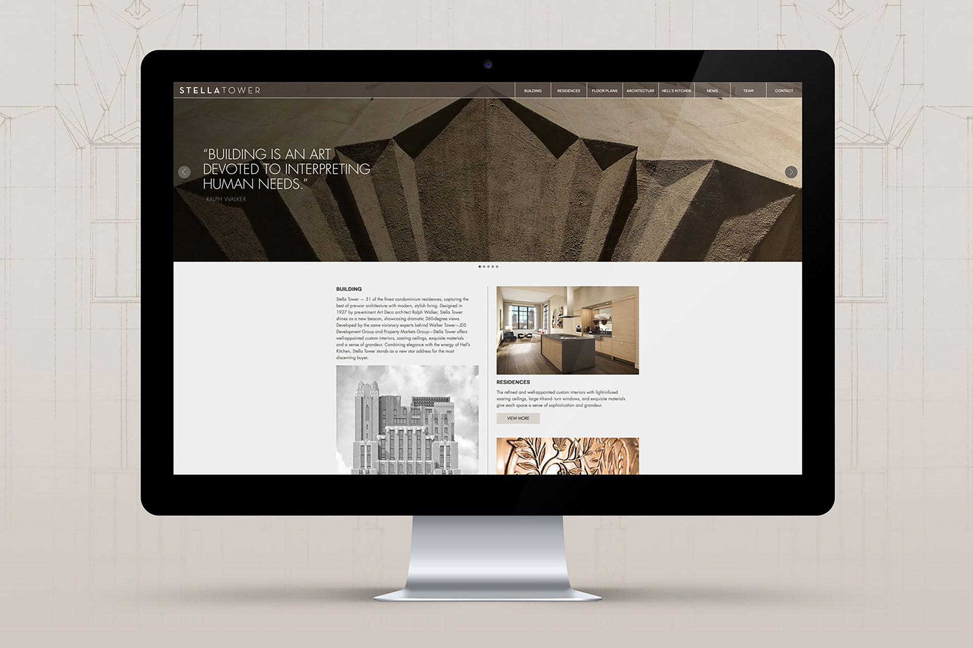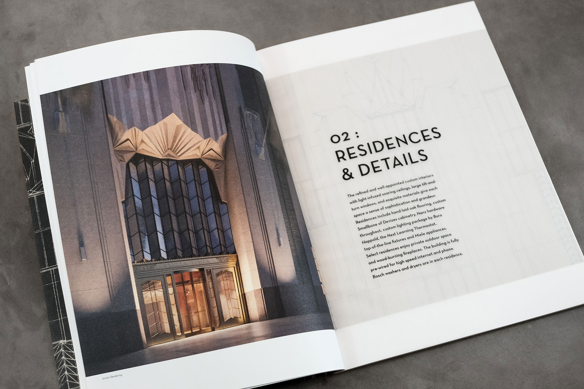 Branding and marketing materials for the Ralph Walker designed condo building in Hell's Kitchen. Pattern is derived from the building's original architectural sketches from the 1920's.